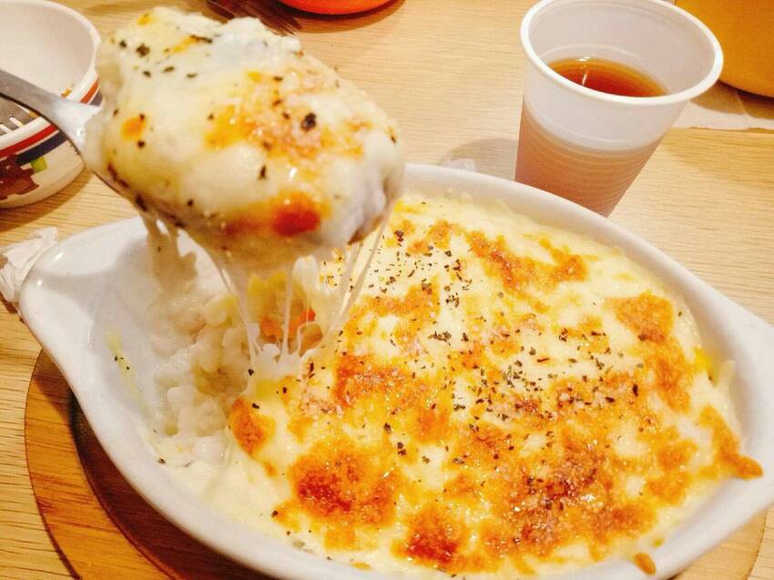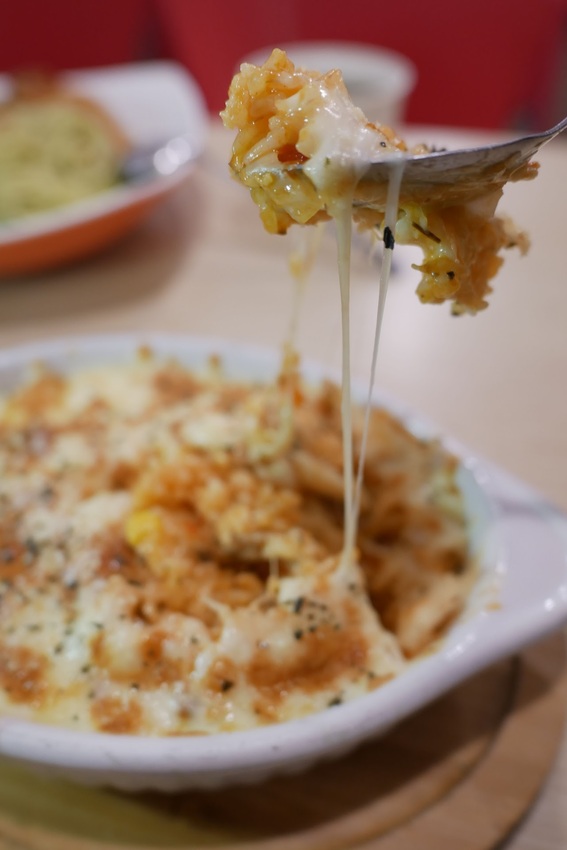 接著焗烤飯,你看看這個拉絲,嘖嘖嘖..真是邪惡呀!!金老闆所有口味的義大利麵還有燉飯,只要加35元就可以升級焗烤,真的超划算。現在到哪裡可以有百元出頭又這麼好吃的焗烤呢?