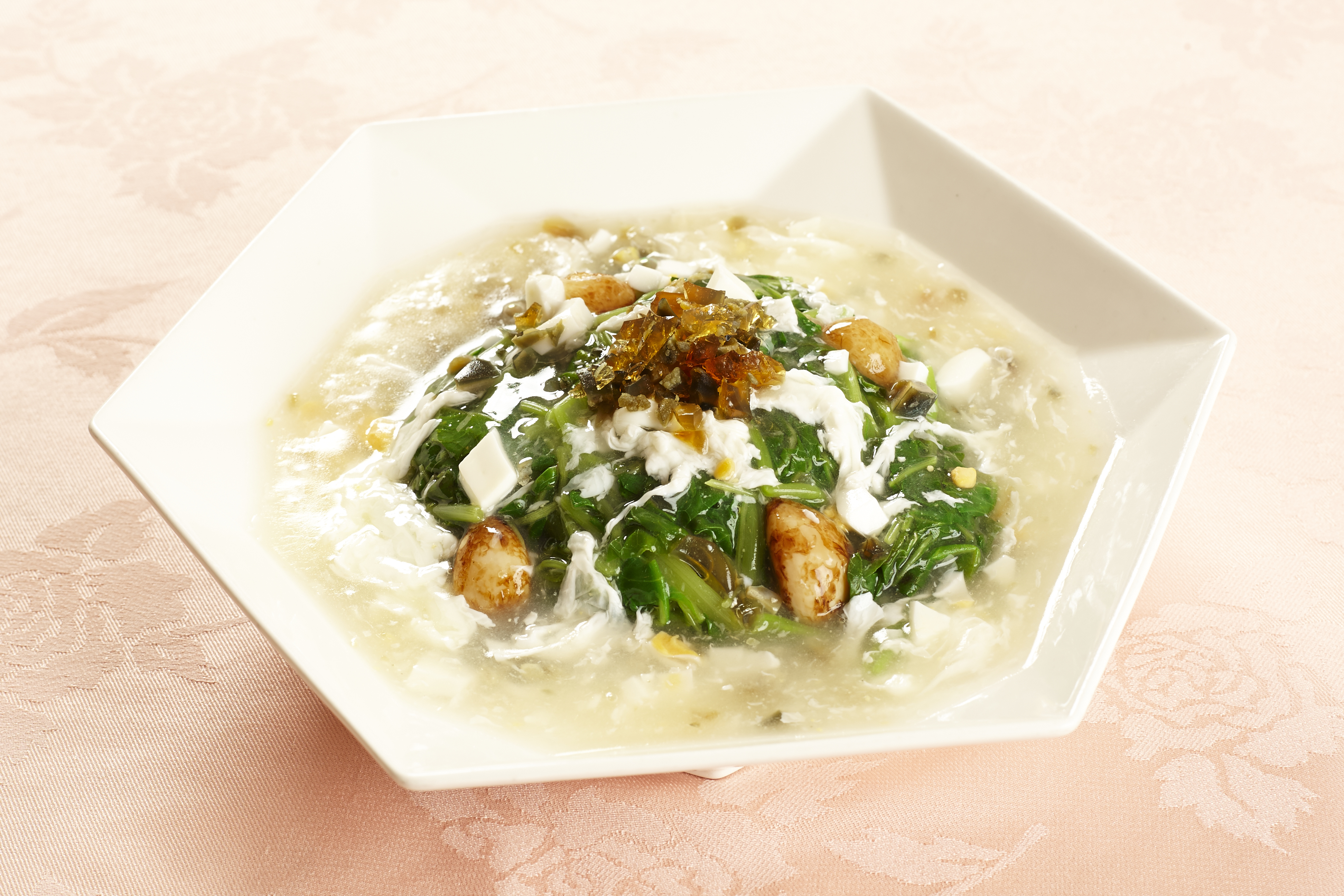 以金蛋、銀蛋做為比喻,加以大火拌炒,將皮蛋的特殊香氣與Q彈口感與鴨蛋的鹹香,透過輕薄不稠厚的勾芡將融匯一起,加入莧菜帶出清爽口感,慢工細活只為給來客道地港式料理。