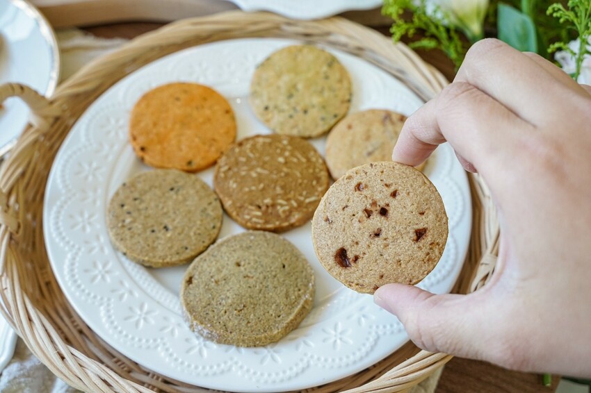 餅乾裡頭更使用了特殊食材增添餅乾香氣,例如馬鬱蘭香草、巴薩米克醋、台灣青蔥、加州西梅等等... 口味獨特好吃