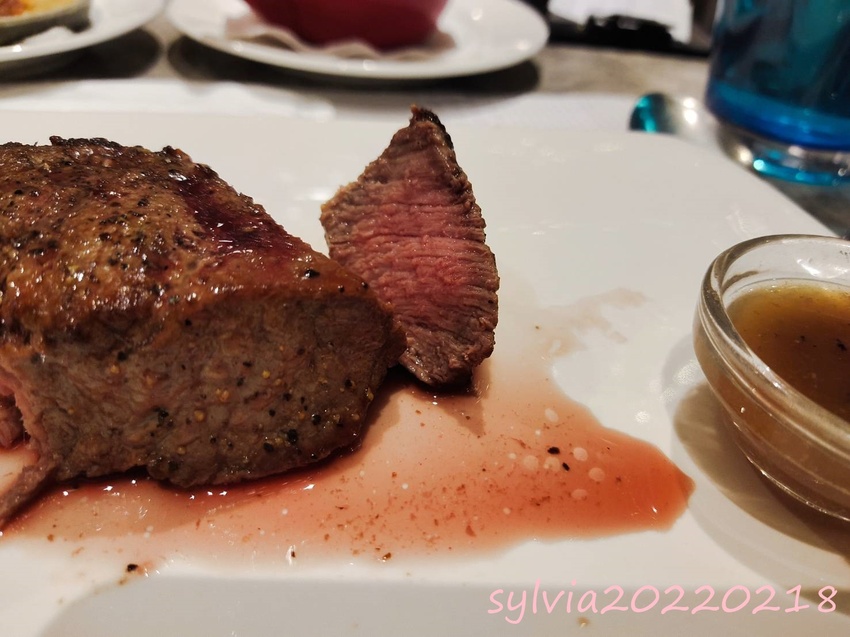 ↓原塊牛排七分熟,原味。它的蔬菜點綴比陶板屋的好太多,也好入口。