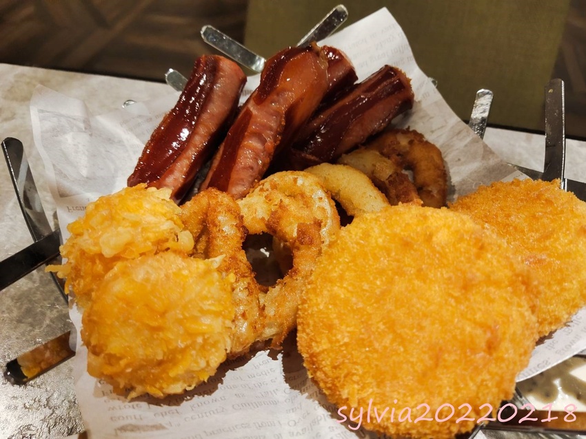 ↓德式香腸、洋蔥圈、可樂餅、蝦球