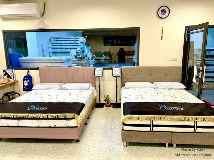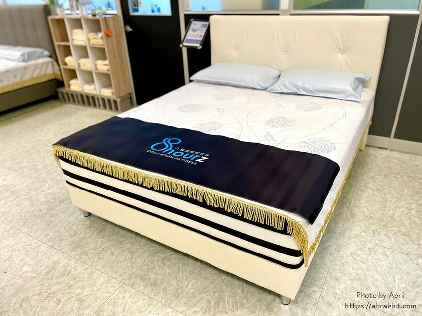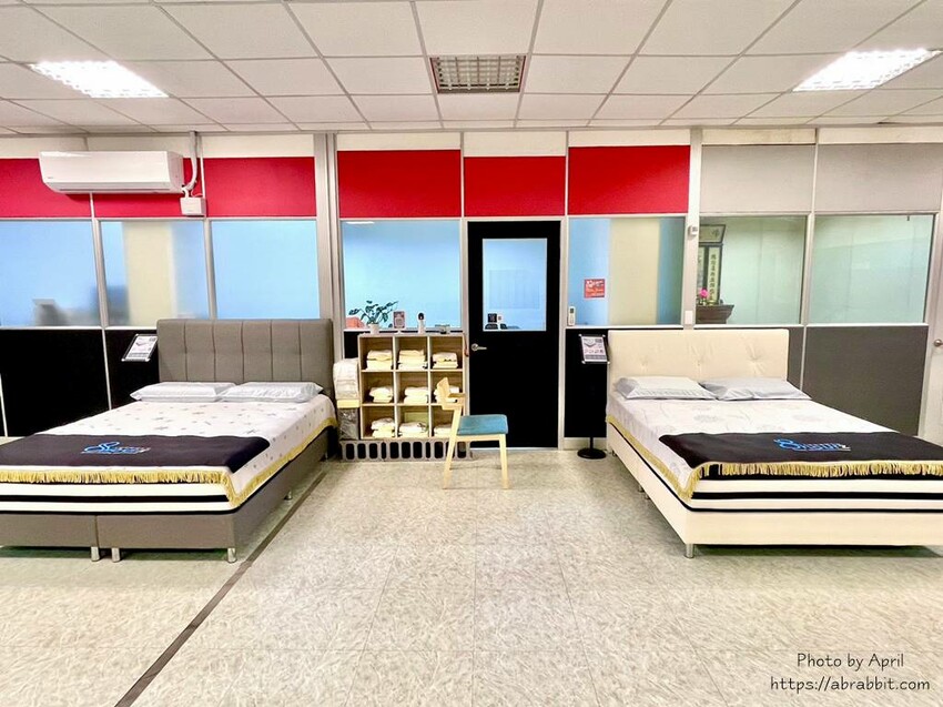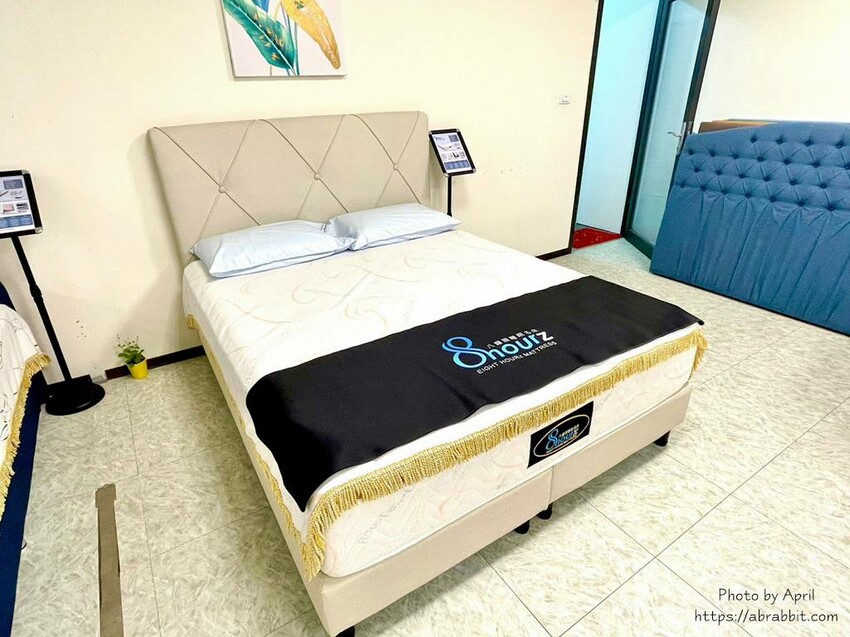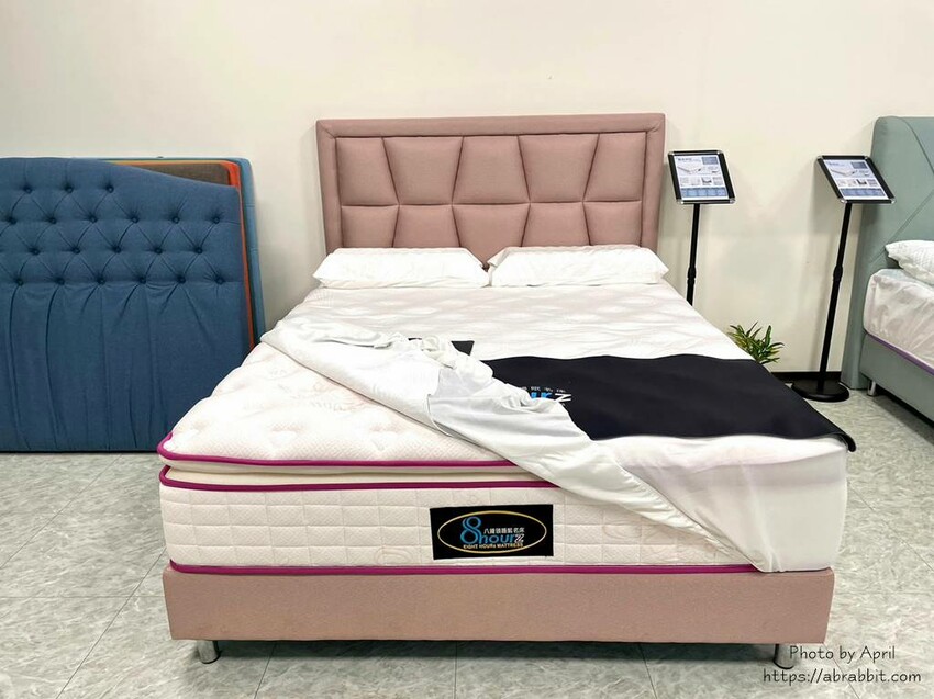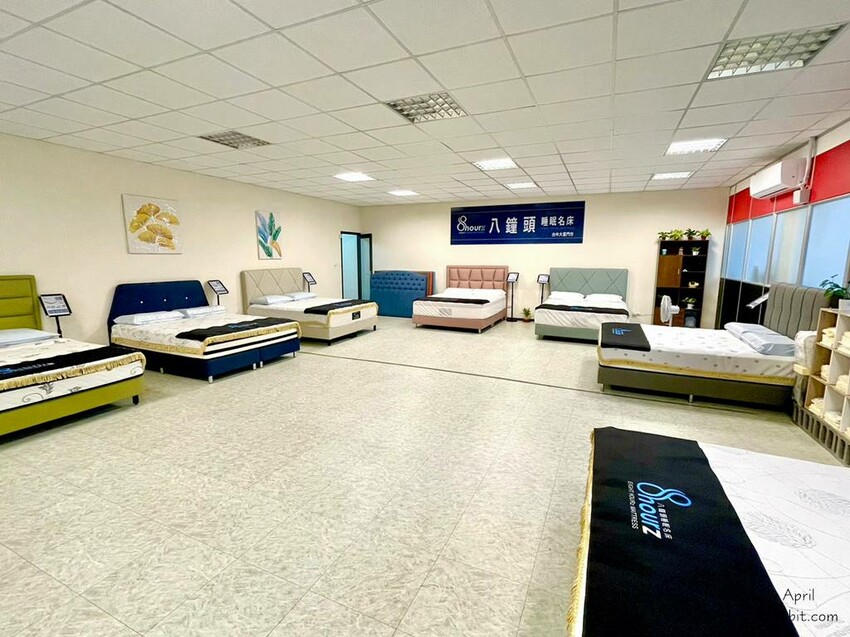 八鐘頭睡眠名床在全台有很多間分店,每間展示中心的現場有會展示9張床,各有特色、軟硬度、厚度的不同,直接試躺感受性強烈,有人喜歡軟一點的床鋪、有人愛硬一點的床鋪,有些床還加上負離子…躺躺看就知道你的身體最愛哪張床啦!
