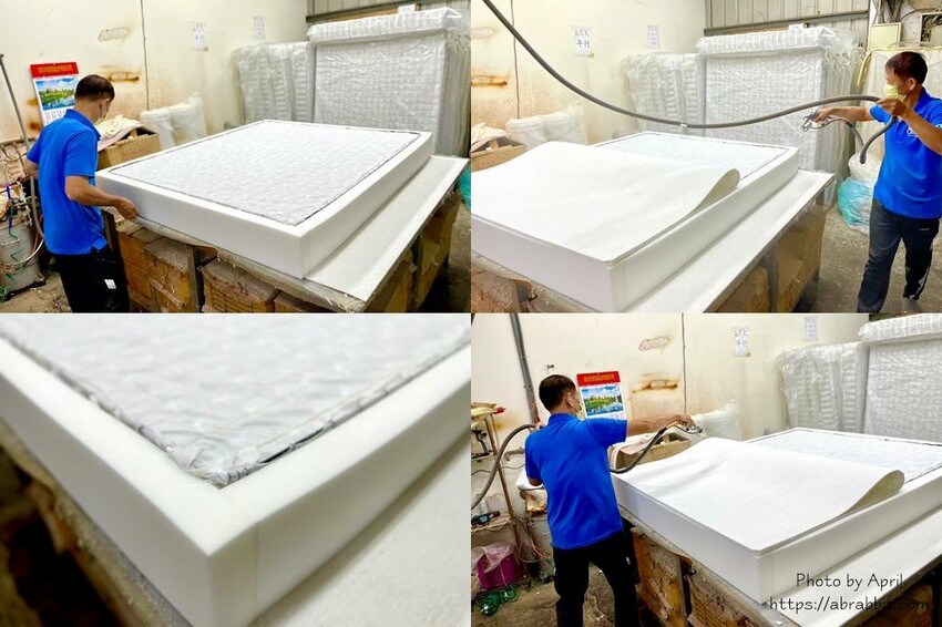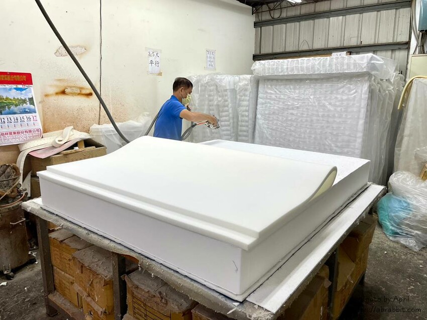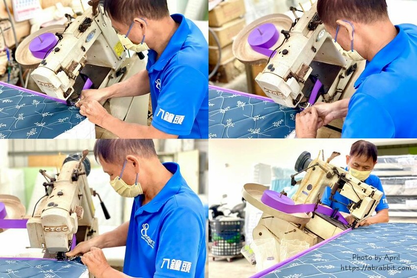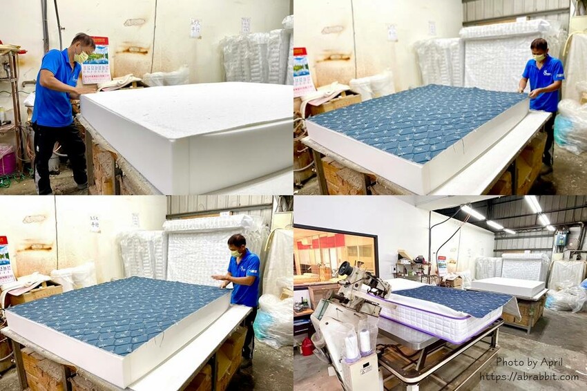 這次來參觀八鐘頭睡眠名床台中廠,這裡除了是能讓客人們體驗的空間之外,一旁也正是工廠,這天我剛好是平日來參觀,正好幸運地碰上師傅正在製作床墊,第一次這麼近距離看師傅製作,超興奮的啊!而且親眼看到也更清楚知道床墊用的是什麼材質,這樣讓人買了才安心呀!