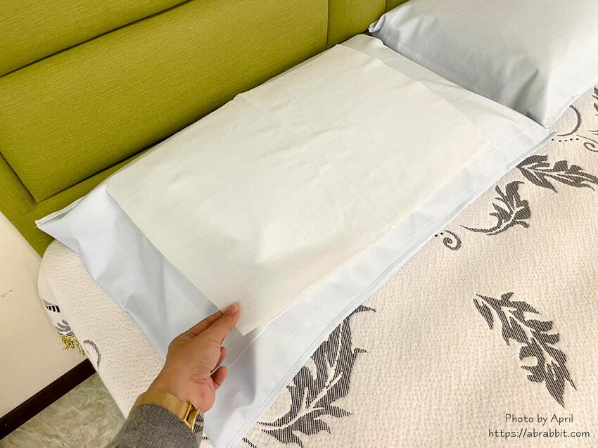 現場的工作人員也會提供拋棄式的枕巾給試躺的客人使用。