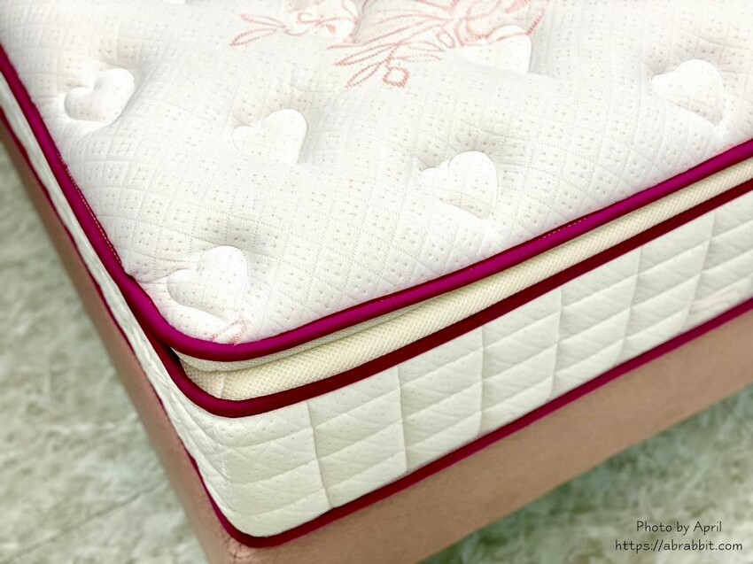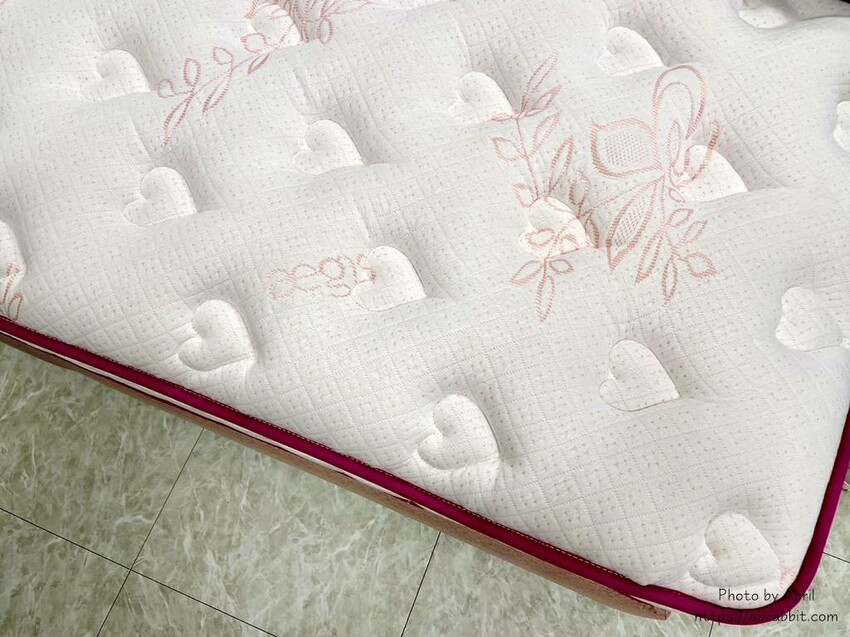 這個表層有比較立體的愛心押花設計,躺下去比較軟綿有蓬蓬的感覺,裡面有比利時彈力 5公分乳膠,整體躺起來是適中偏軟的軟硬度。