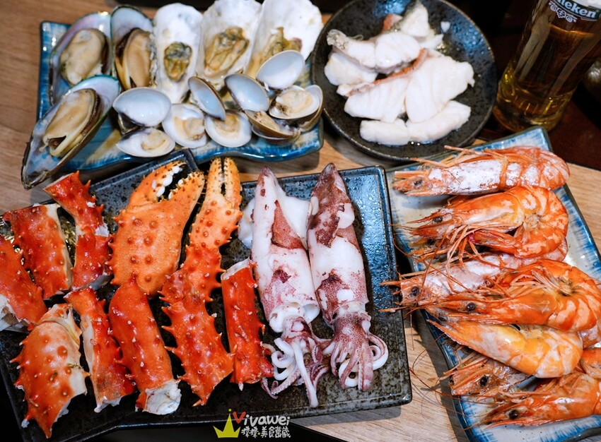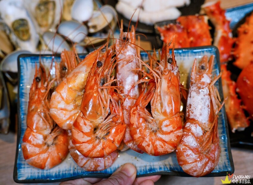 ▲海鮮類有生蠔、蛤蜊、貽貝、冰鮮小卷、草蝦、白蝦、天使紅蝦、青衣、鱸魚、紅條石斑及帝王蟹!在海鮮盤底部還有鋪上滿滿的碎冰塊~讓食材上桌後還能保有鮮度!