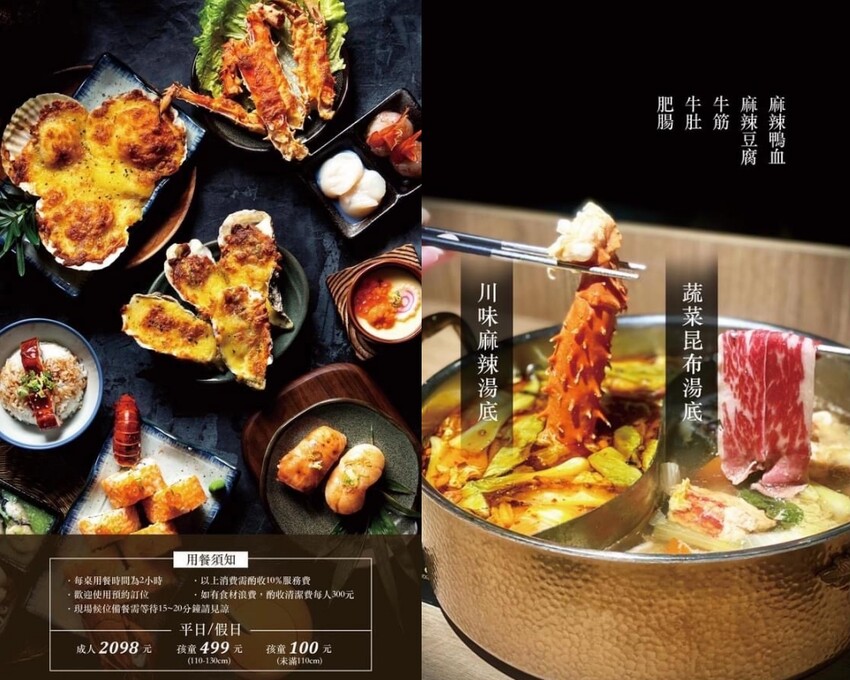 價格為成人2098+10%、兒童110cm-130cm 499+10%、幼兒未滿110cm 100元清潔費,用餐時間為2個小時,點餐時間為1.5小時,全食材(手工甜點除外)皆無限量供應!