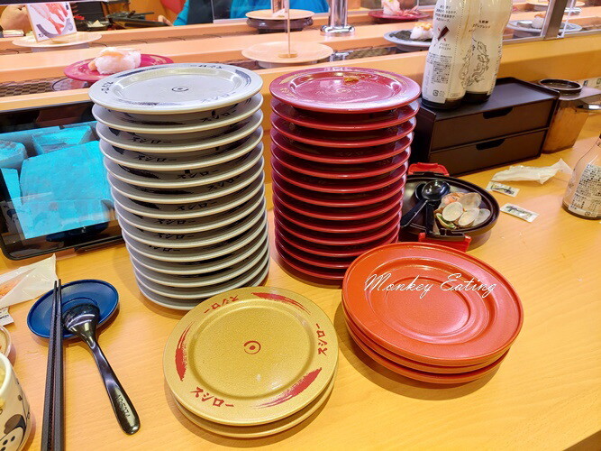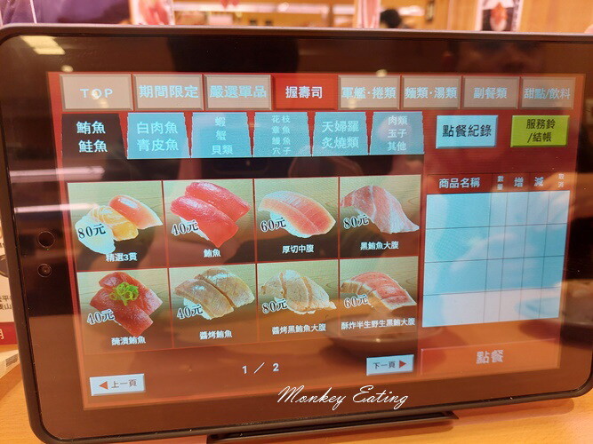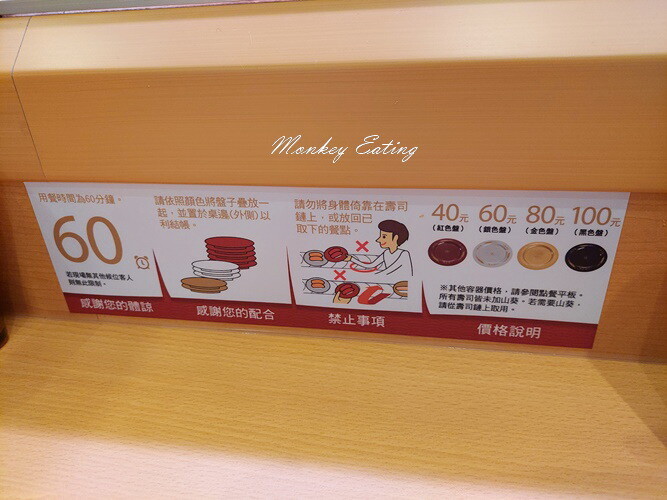 檯面上的壽司看到想吃的可以拿,也可以點選平板上的菜單,會有另一條軌道送餐到你餐桌前,用餐限時1小時