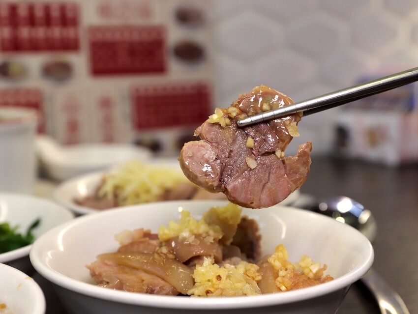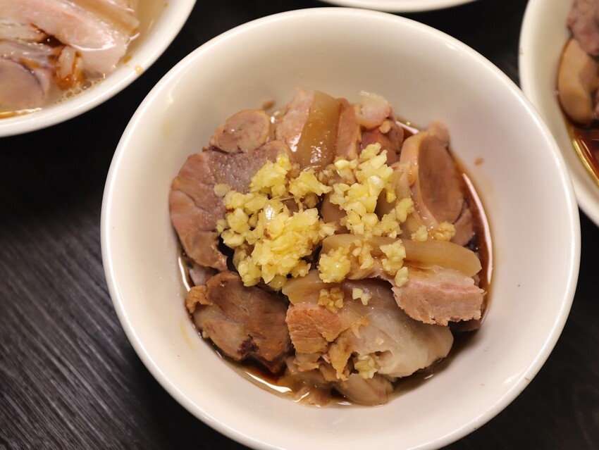 將豬腳切片後 燙煮加熱、拌上店家自調醬汁、最後來把蒜末!