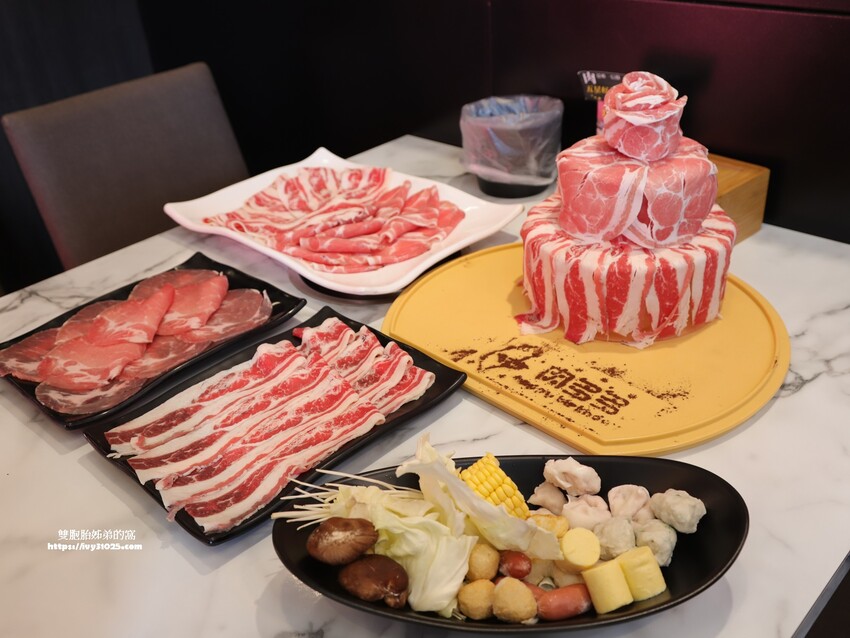 陸續上桌有肉多多生日浮誇蛋糕,服務人員還特地幫我用兩種不同肉品裝飾蛋糕,讓整體蛋糕看起來超有創意及特色,以及還有西班牙橄欖豬、濕式熟成牛腹肉、濕式熟成霜降牛等三種火鍋肉品,忽然有種會吃肉吃得飽到不行的直喊真的肉很多,因為怕吃不完我們點的肉盤,所以火鍋食材拿得不多。