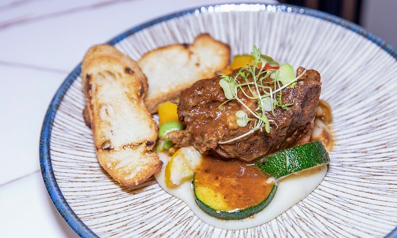 勃地根紅酒燉牛肉,燉得像牛膝般軟嫩的牛肉有著牛肉醬甜和紅酒香交錯的滋味,那燒出的醬汁佐醬包、烤過的櫛瓜都不錯。