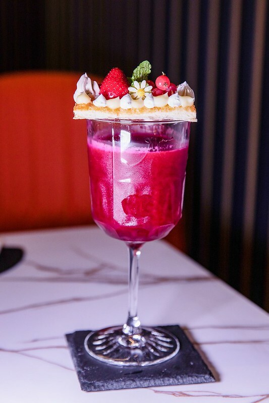 祕境特調紅房子,紅房子指的自然是圓山大飯店,而這杯調酒最大的特色是以過往為了元首特別釀造的窖藏陳高、琴酒調的,上面還有一片漂亮的草莓花園千層派,等於是一杯調酒加上一份甜點,視味覺合而為一。一入口就有屬於陳高的醇厚風韻,但酒氣卻顯得相當柔合,紅色好像是加了點火龍果和甜菜根,不喝酒的朋友應該也能淺嚐幾口。