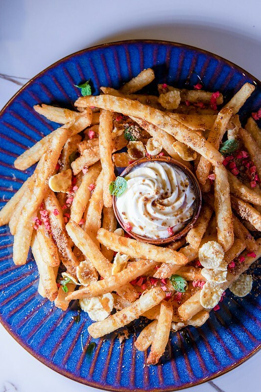 薯條調味偏重且口味豐富,佐酒卻十分涮嘴,中間帶點檸檬香的奶霜亂好吃的。