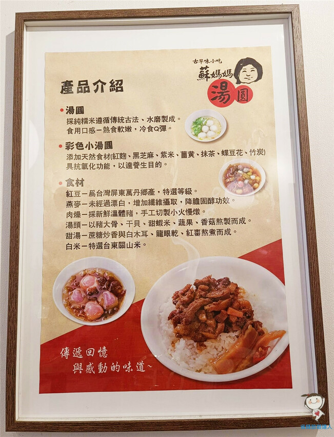 牆上還有關於蘇媽媽產品的詳細介紹,包括湯圓的各種食材,真是鉅細靡遺啊~