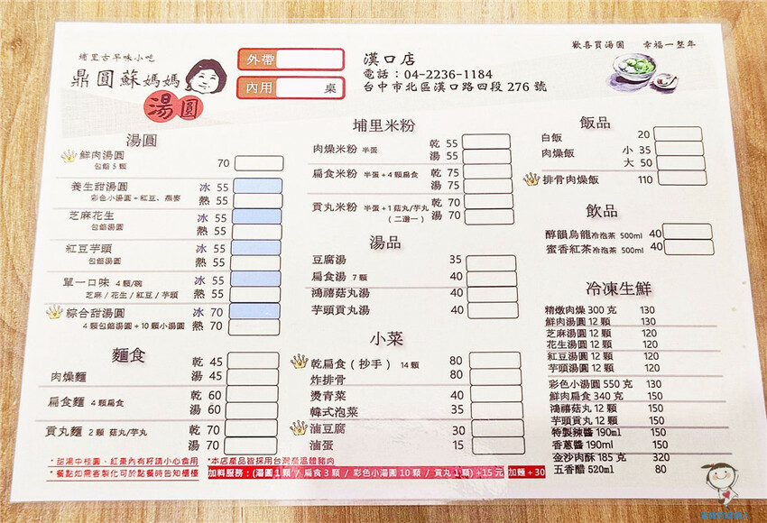這張就是蘇媽媽湯圓漢口店的菜單,看得出來多數都是銅板價