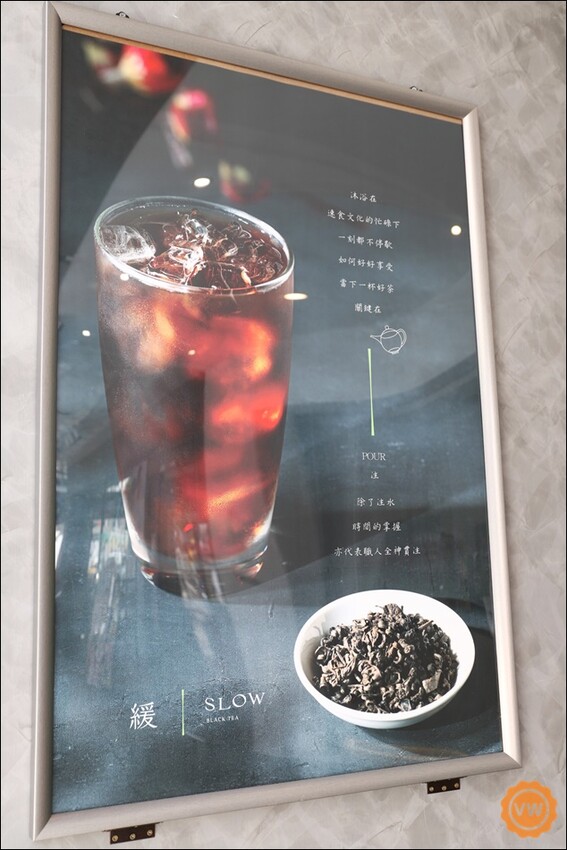 緩茶嚴選台灣在地茶葉,結合茶師的好手藝,堅持好的茶品帶給大家的味覺饗宴,期待走進緩茶的每位顧客都能放慢腳步,欣賞藝術的同時也能仔細品嚐每一杯茶飲帶給你的茶韻之旅!門市外的柱子上的看板也有著濃濃的藝術氣息。