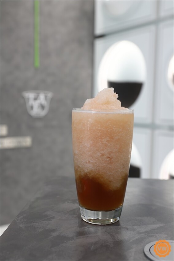 使用緩緩紅茶為基底,搭配新鮮的葡萄柚汁,入口時可以喝的到紅茶中,淡淡的蜂蜜香氣與酸甜,但又可以巧妙的與葡萄柚完美融合,拂面而來的涼爽感,仿佛漫步在秋日的午後。上層是加入葡萄柚原汁果肉打製成細碎的冰砂狀,但是介於冰沙及碎冰的口感,每一口都可以吃到濃郁的葡萄柚香,