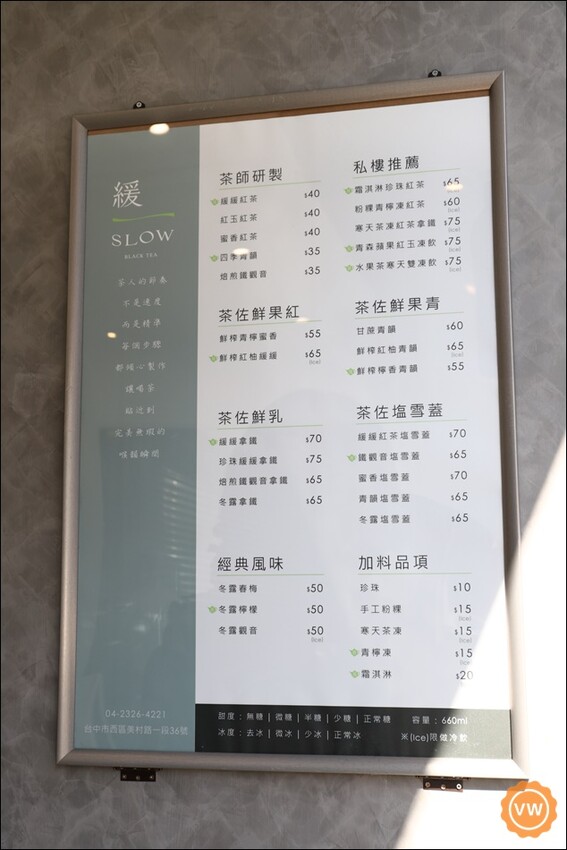 目前緩茶的茶飲共有茶師研製、茶佐鮮果紅、茶佐鮮乳、經典原味、私樓推薦、茶佐解果青及茶佐塩雪蓋共七大系列,至於配料的部份則是有常見每日現煮的珍珠之外,還多了店家自製的手工粉粿寒天茶凍青檸凍及霜淇淋!