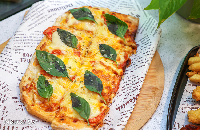 經典不敗的瑪格麗特羅馬披薩絕不能錯過啊!NANA很愛吃起司,所以+20元升級為雙色起司加量,這樣一來就能吃到雙倍量的雙色起司,光想就覺得垂涎三尺呀!話說這個披薩是一款在義大利羅馬地區傳統披薩,使用義大利小麥麵粉加入冷壓橄欖油製成麵團,透過老麵的發酵方式經過二天長時間發酵,麵皮香氣十足帶有獨特的柔韌口感,再加入起司、蕃茄紅醬、羅勒製作,上桌時香氣撲鼻,我的肚子不爭氣在哀叫,更特別是PIZZA是長方形狀,並且會事先切成八塊,無論是多人分享或獨自享用都很適合。接下來拿起一塊咬下,天啊~它的餅皮薄脆與富有咀嚼勁的力道,咬起來外酥內軟,再配上豐富食材承前啟後地刺激味蕾,使瑪格麗特展現出恰到好處鹹香味,真心覺得好吃必點。