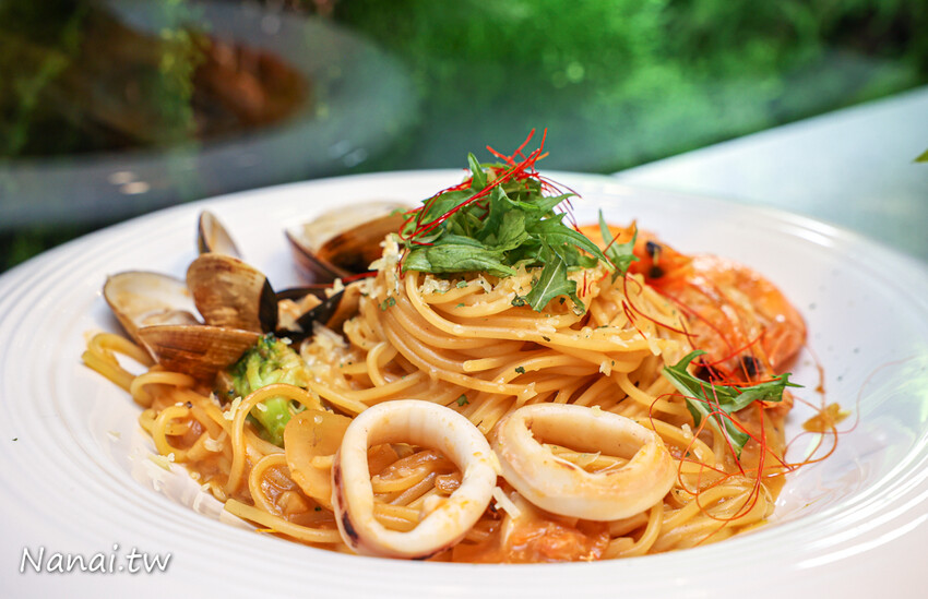 喜愛吃海鮮可以來份茄紅醬經典海鮮義大利麵,它裡面海鮮有魷魚、鮮蝦、蛤蜊三種食材,豐富又有自然鮮甜味。這個麵身嚴選進口義大利麵100%杜蘭小麥製成,醬汁則是主廚特製鮮味龍蝦醬調製,特別是麵條吸收了所有醬汁的精髓,每根牢牢的吸附,每一口酸甜又濃郁,麵條咬起來Q彈有勁,軟硬度是普遍能接受的口感,這整體味道挺不賴的!