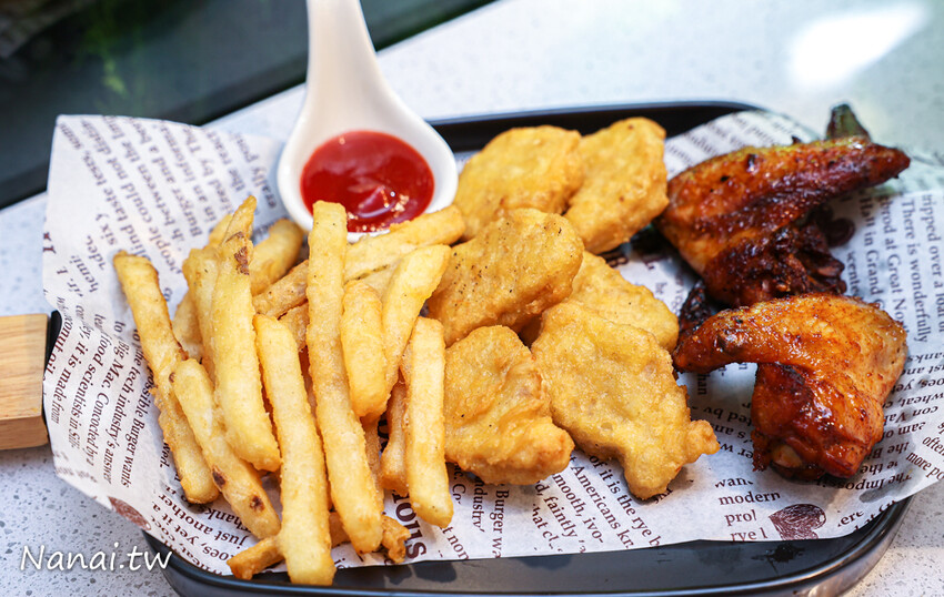 帶小朋友來用餐,NU家的經典三拼盤也是人氣王!這道餐點有兩塊醬烤雞翅、香酥雞塊、薯條,還會附蕃茄醬。它的醬烤雞翅是主廚特製,它的醬汁完全吸附於雞翅上,吃起來紮實彈牙卻不會太柴,口味鹹甜有特殊香氣,雞翅是好吃的。再來薯條和雞塊火侯炸得剛剛好,咬起來外酥內香,會越吃越停不下來~