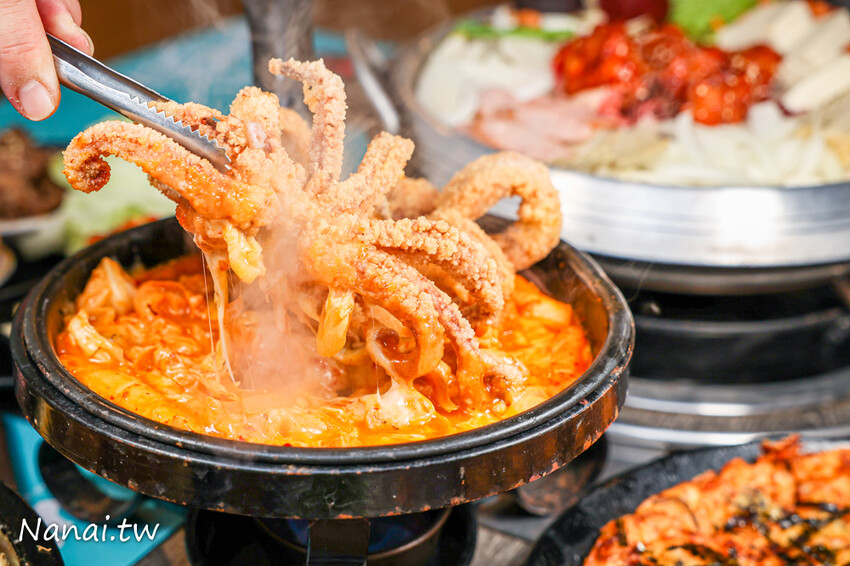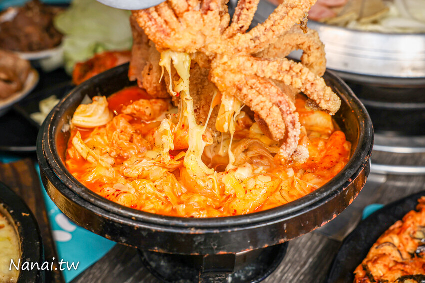 沒有最狂,只有更狂,O八韓食嚴選阿根廷深海大魷魚,外層再裹上麵衣下油鍋炸,炸至金黃酥脆後,下方鋪上厚厚起司、魚板、泡菜、軟Q年糕、特製辣醬,此時鑄鐵鍋裡香濃飽滿起司還不斷冒煙好邪惡,接著小編夾起一塊炸魷魚,起司跟著也一起刊西,光用看的好動心~