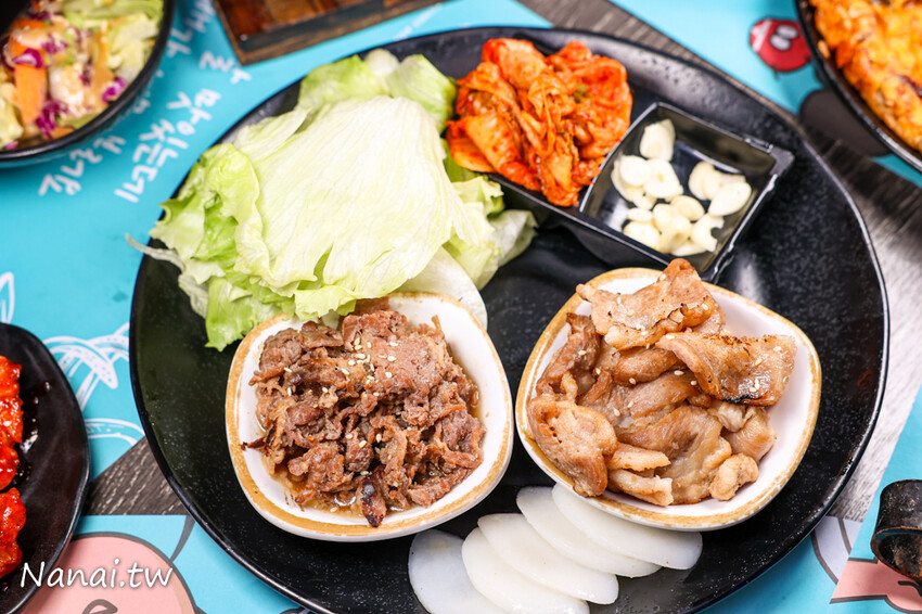 當天我們將經典生菜包的肉量升級+60元,是套餐前菜,有韓式泡菜、蒜片、生菜、豬五花、醬燒牛、年糕等食材,將豬五花或醬燒牛放在生菜上面,再添加韓式泡菜或蒜片提味,包起來大口咬下,醬燒牛的鹹香與泡菜的酸辣味,還有蔬菜爽脆感,豐富層次在口腔交融,正好可以解油膩,至於豬五花和醬燒牛,醃的入味又不乾口,連同行友人都說好吃,對了~如果美生菜不夠可再加點,一份是60元,若不吃牛的話可以將醬燒牛改成蜜汁豬。