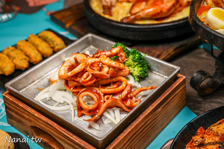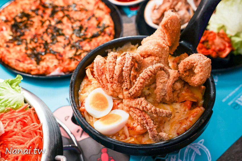 店裡最吸睛就是巨大魷魚躺在鑄鐵鍋上,底層還鋪滿滿的起司年糕和一顆水煮蛋,不只是魷魚外表酥到不行,黃澄澄的起司牽絲的模樣更是邪惡至極,讓人忍不住想要通通嗑光~