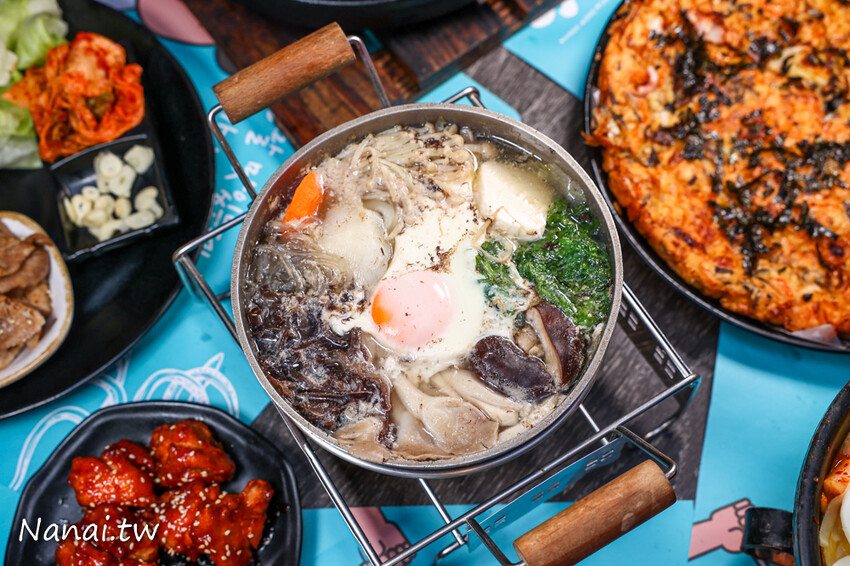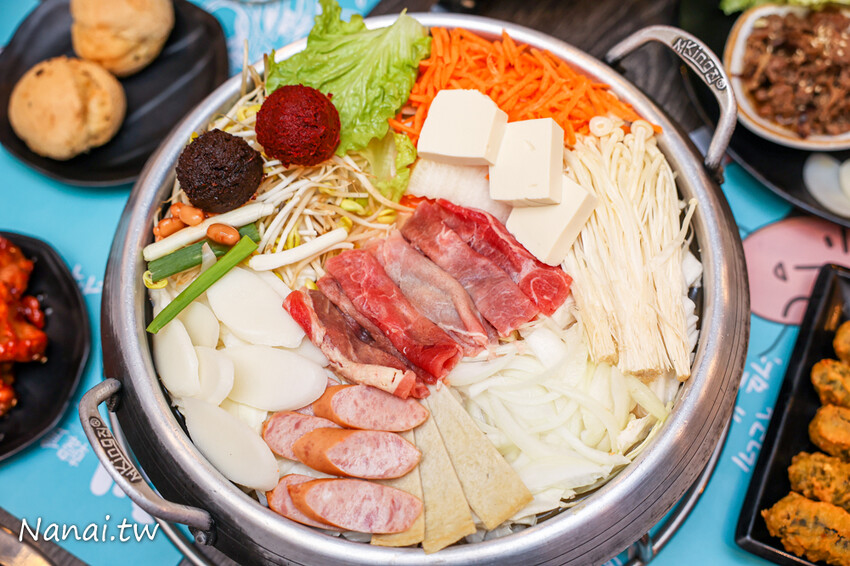 韓式炸雞部隊鍋真的很澎湃,光是配料就有好幾種,像是豆腐、豆芽菜、金針菇、魚板、紅蘿蔔、洋蔥、韓國泡麵、香腸、年糕絕不少,最後擺上主角韓式炸雞和牛肉片,豐富畫面令人想大快朵頤。
