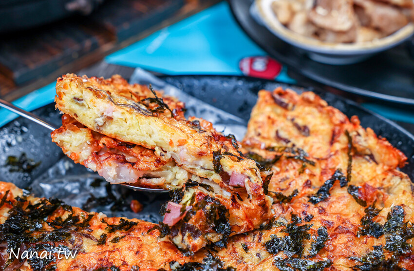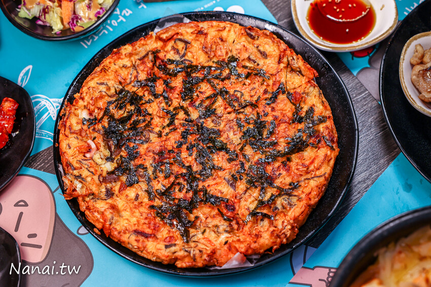 還有酥香厚實的海鮮煎餅一吃就愛上!你看看~照片中的份量與大小,根本比我的臉還要大,說真的兩個人吃超有飽足感,差點飽到天靈蓋,不過比起坊間韓式煎餅,我更喜歡O八韓食家的,他的用料灰熊澎湃,有滿滿蝦肉、魷魚、高麗菜絲、木耳絲、紅蘿蔔絲..等,再以半煎半炸料理,最後撒上海苔絲太霸氣啦~
