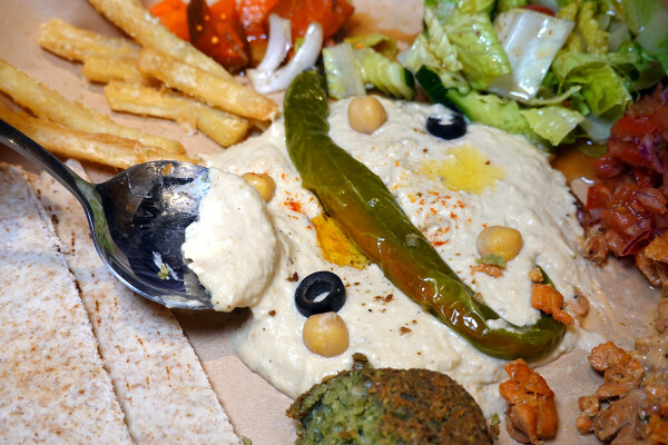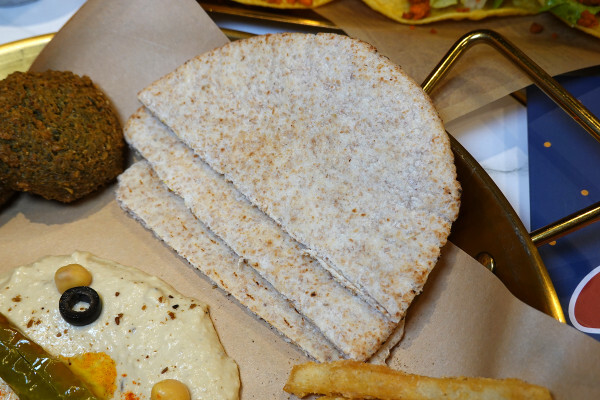 可以將香料雞肉、炸鷹嘴豆丸、鷹嘴豆泥、番茄丁、生菜、大黃瓜、炸薯條放進中間的口袋裡,喜歡吃甚麼就能加什麼,好吃又有DIY的趣味感。