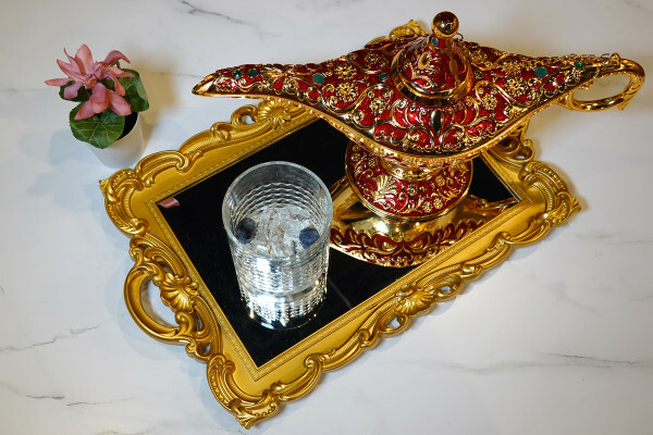 鏡面的金色托盤和華麗的神燈酒壺超浮誇的啦!用阿拉丁神燈來裝酒真的好酷喔!拍照上傳打卡超有梗!(未成年請勿飲酒.酒後請勿開車)