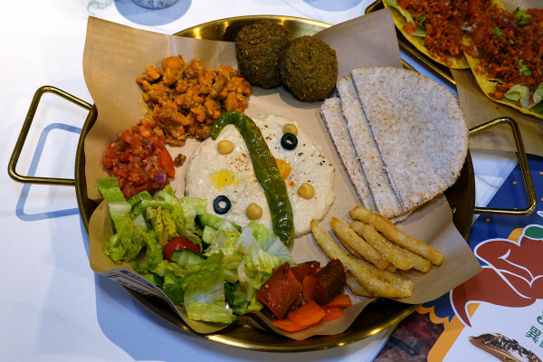 中東批塔拼盤的口味很多,而葷的、素的都有,我們點的是香料烤雞口味,除了pita餅之外,還有很多特製配料。