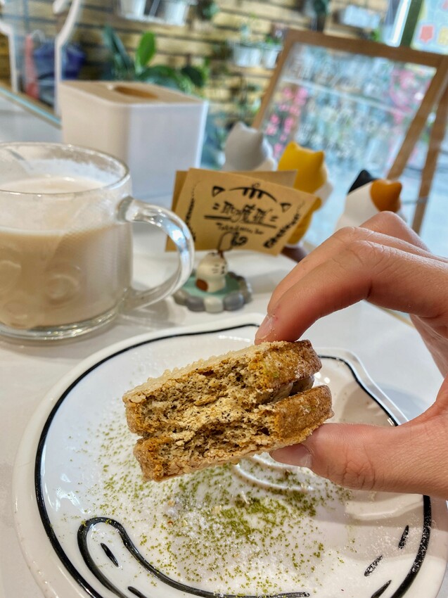 一口咬是柔軟的口感,表層一層很薄很薄的脆皮,微微冰涼不甜膩的內餡,還有微微茶香,配上咖啡或是熱紅茶很不錯!
