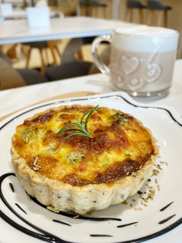 咬下第一口是滿滿的奶香,軟軟糯糯的馬鈴薯泥,柔柔綿綿的在嘴裡化開,雞肉的口感還有一點洋蔥的香氣,上面金黃金黃的起司被焗烤的脆脆的,烤好的鹹派,餅皮也不會濕軟,反而酥脆,整體鹹度很剛好,吃了第一口整個愛上,跟甜點相比,萍姐很推薦大家可以點個鹹派喔!