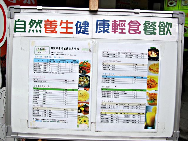 外觀招牌寫的天天五蔬果、健康跟著走、日日一蔬食、身心最舒服