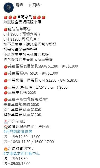 台南這家「飛鳴」甜點工作室,以製作甜點為主商品除了有臉書可看到的一般商品項目及規格之外,冬天也有推出季節性的草莓系商品。