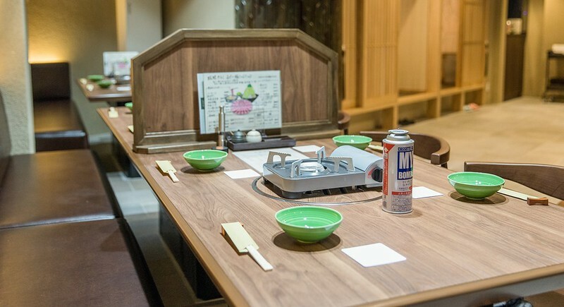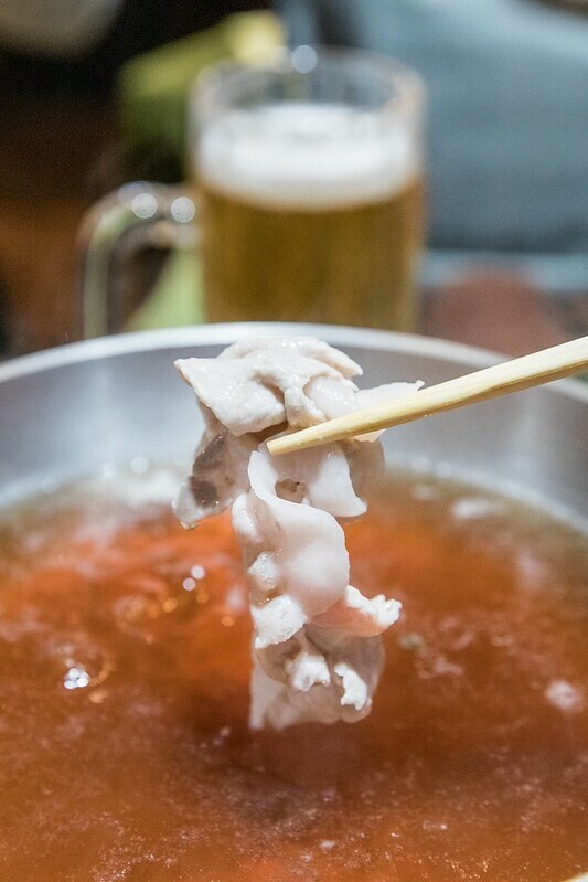 當下並不知道這是新開的店,只聞到一點像是重新裝潢的味道,應聲說著:「いらっしゃいませ」的女服務人員比客人還多,而事實上是只有我們一組客人...。店的右邊是像能喝酒的吧檯,左邊是涮涮鍋的四人桌子,裡面還有可以吃燒肉的包廂。