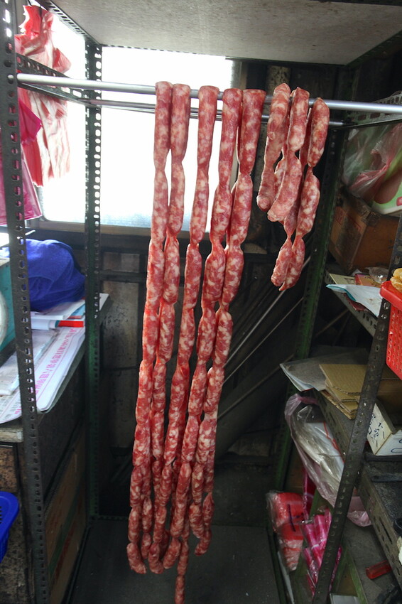 店裡有放置桌椅因疫情關係暫時停止內用,看到裡面香腸忍不住拍張留念。