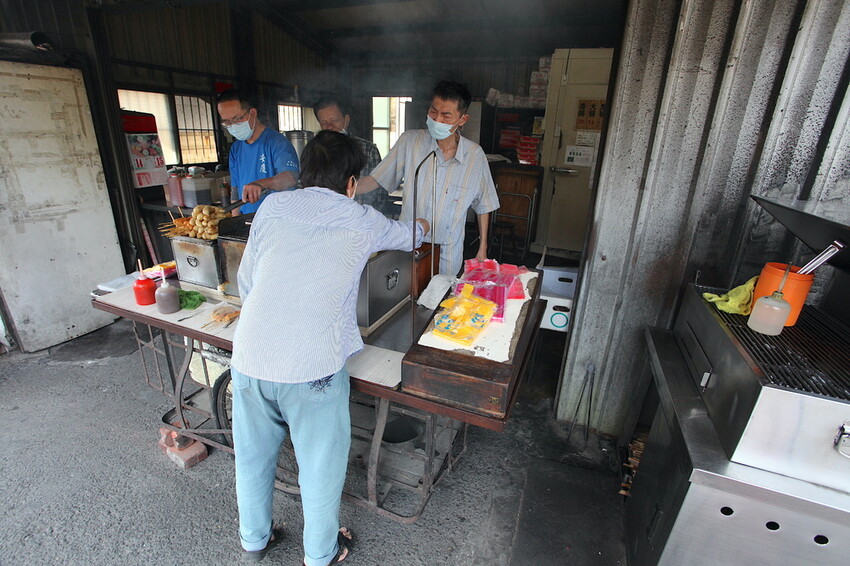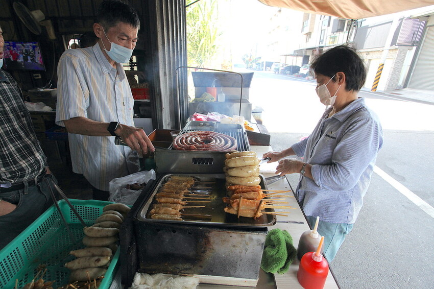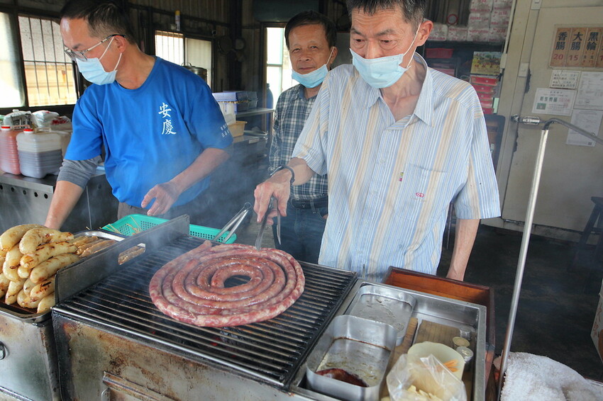 台南特色就是把香腸捲成圓形來炭烤,這樣來烤香腸速度快卻要有技巧。
