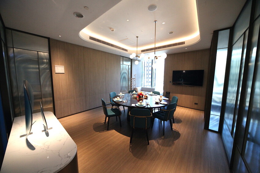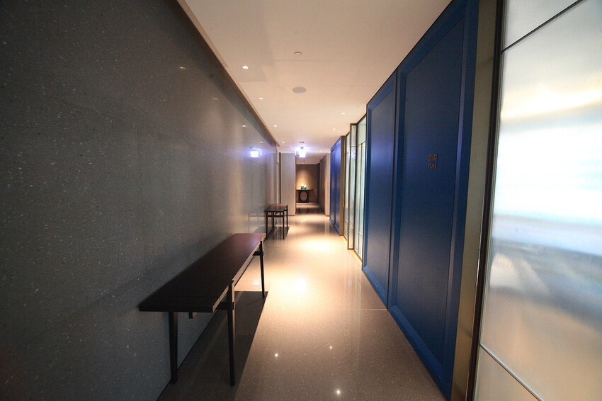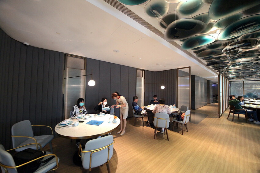 這寬敞的迎賓大廳一入眼簾很夢幻,牆壁跟天花板下足設計意涵,牆面藍色山陵的曲線勾出港都的優雅,天花板貝殼的造型跟夢幻的燈光,投射出來配合地板的倒影,讓人感受到在夢境裡好像不存在。