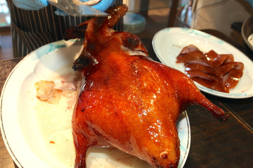 這麼大隻烤鴨僅把表面部分鴨肉切下來,小高有觀察切下的鴨肉份量不多,其餘鴨肉是用來製作另外二吃餐食。