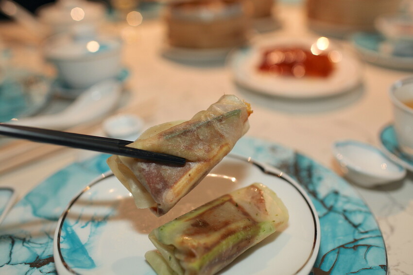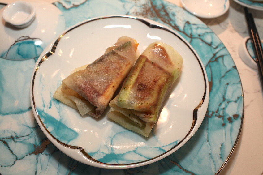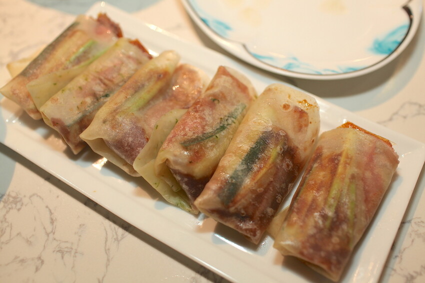 服務員先送上兩卷卷上餅皮烤鴨來吃。