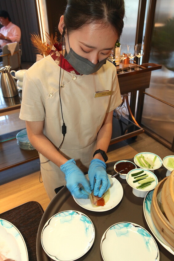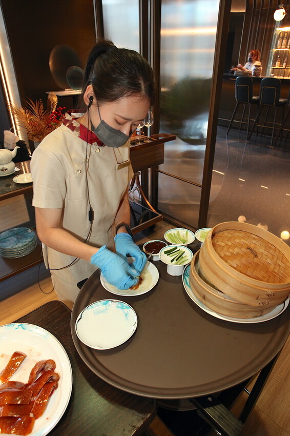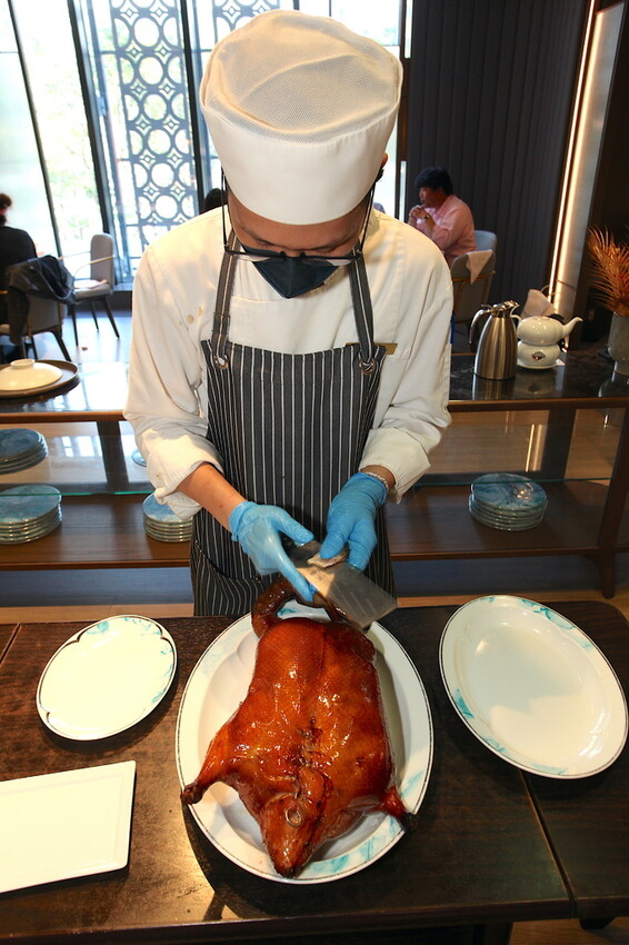 首先把廣式掛爐的烤鴨推出來桌邊服務,由廚師和服務員來料理跟解說,飯店嚴選重3.5公斤的屏東溫體櫻桃鴨。