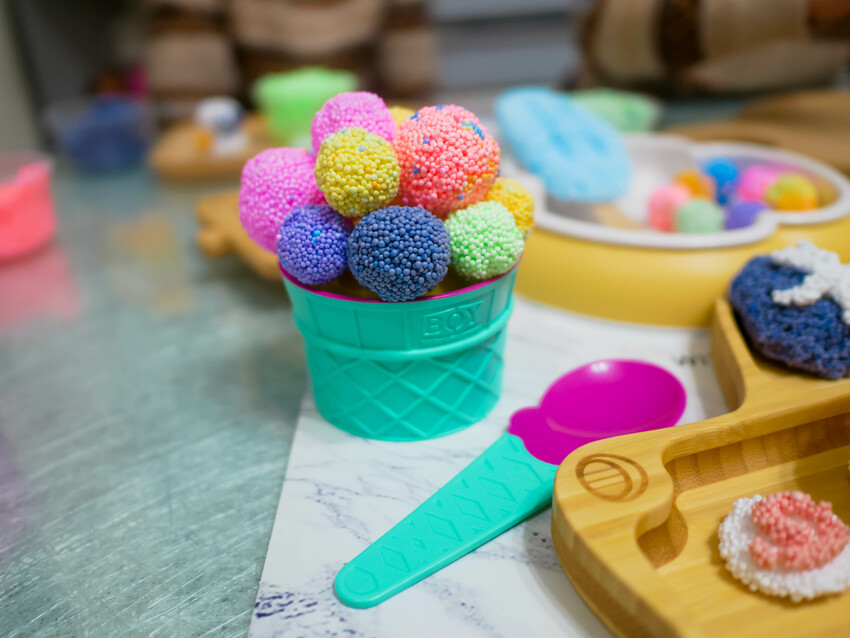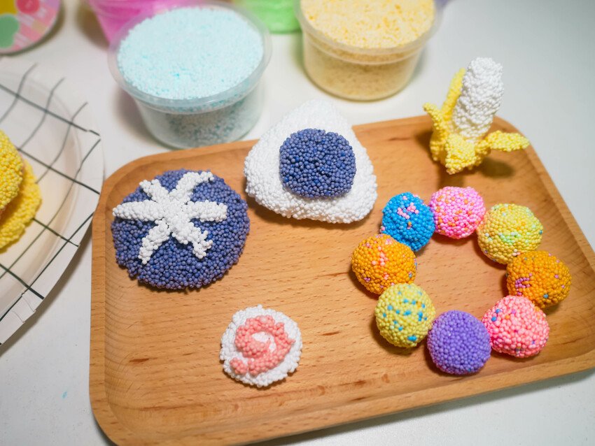 多樣化顏色可以製作出彩色冰淇淋、甜甜圈、日式壽司、香菇、魚板、香蕉...等