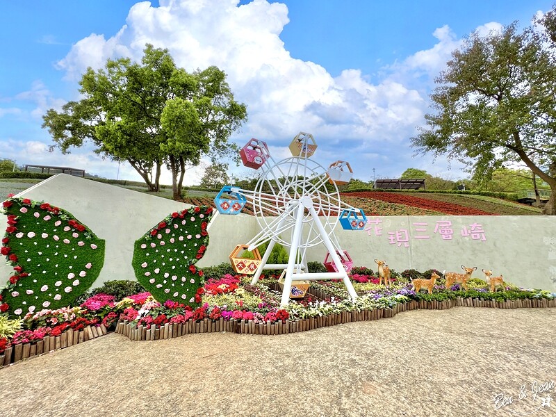 花海下方有可愛的摩天輪和梅花鹿,還有美麗的蝴蝶哦,上面還有花現三層崎的字樣