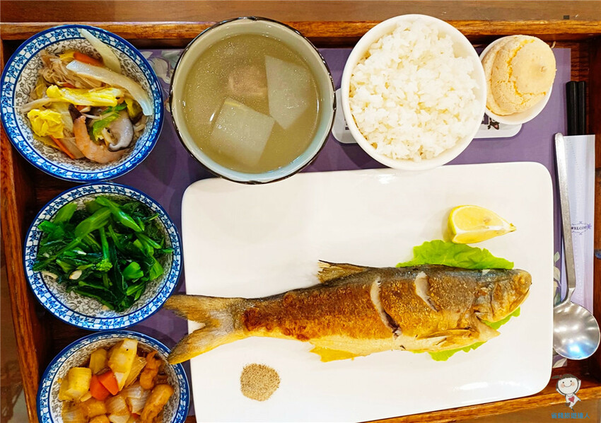 潔西卡點了這份香煎黃魚套餐$360,總共有三菜一湯+甜點