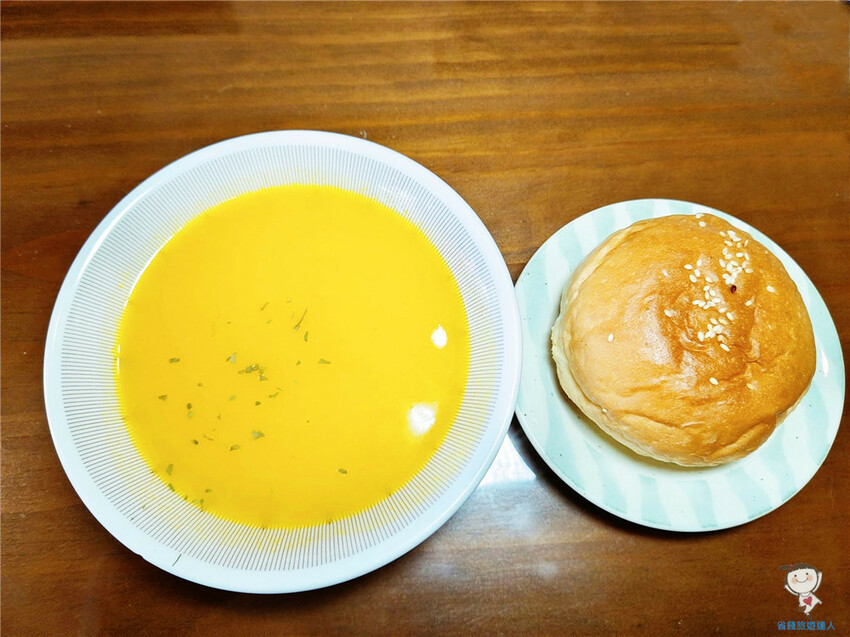 附餐是南瓜濃湯和小餐包,拿餐包沾著濃湯喝,也比我想像中好吃
