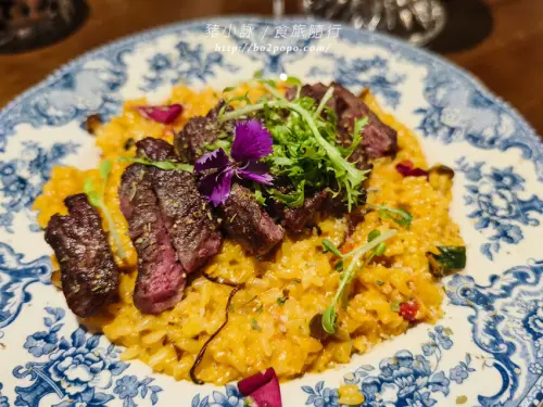 ▲濕式熟成牛排佐紅酒牛肉醬汁 588元(七分熟),使用義大利橄欖油、熟成牛排和季節時蔬,季節時蔬總類很豐富,可以吃到好幾樣蔬菜,牛排呈現漂亮的粉色,但肉質有些鬆散,咬起來少了點嚼勁,個人不是很愛。