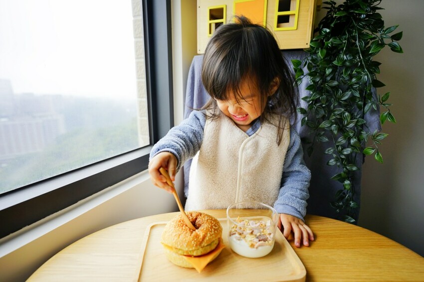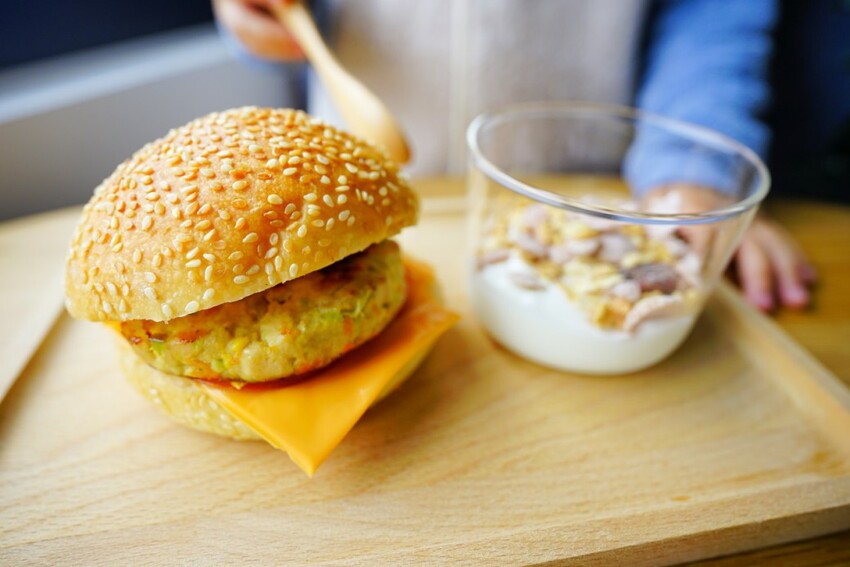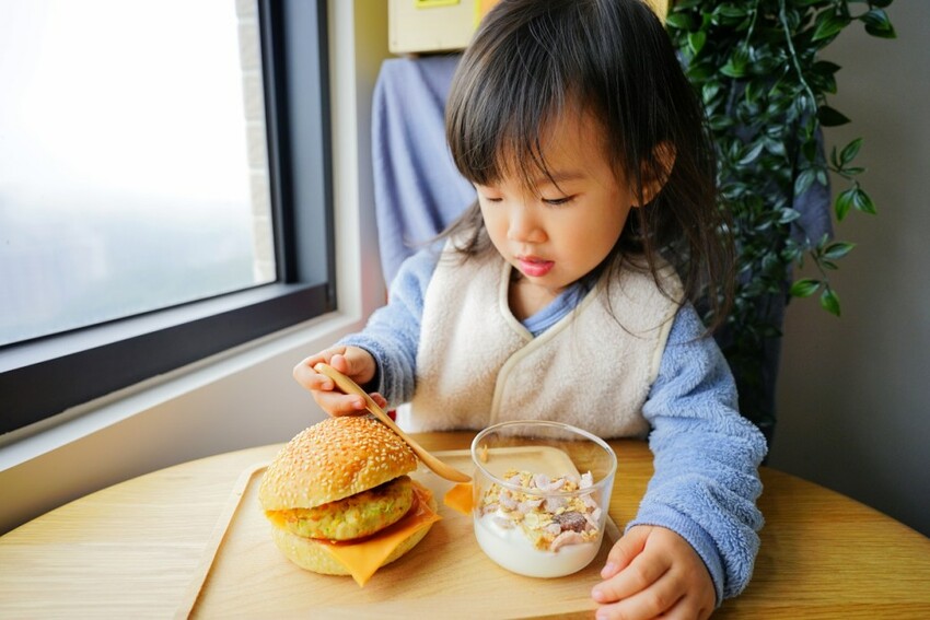 因為小孩不適合吃生菜,特別做了一個寶寶版漢堡,再搭一小杯優格穀片,